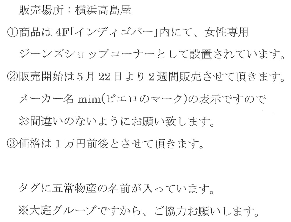 梅雨入りでしょうか。 明日からあまり天気がすぐれないようです。 暑いの好きですが、湿気が多いと古傷が痛みます(T_T) さて、ホットなお知らせです。 当社は不動産の他、警備保障、リフォーム、和菓子屋など 多種多様に商売をやっていますが、新たな商売を追加しました。 見ての通り、女性専用にて 男性は彼女や奥さんのプレゼントに 女性は自分用にいかがでしょうか。 伸縮するので履き心地抜群との噂です。 来週の火曜日まで、短期販売の予定ですので大庭商店グループに愛の手を・・・・・ 場所は上記画像にある通り 横浜高島屋4階(婦人服)インディゴバー内です。 タグに「五常物産」とあります。 ピエロのマークが目印です。 PR 2013/05/28 (Tue) 18:27:56