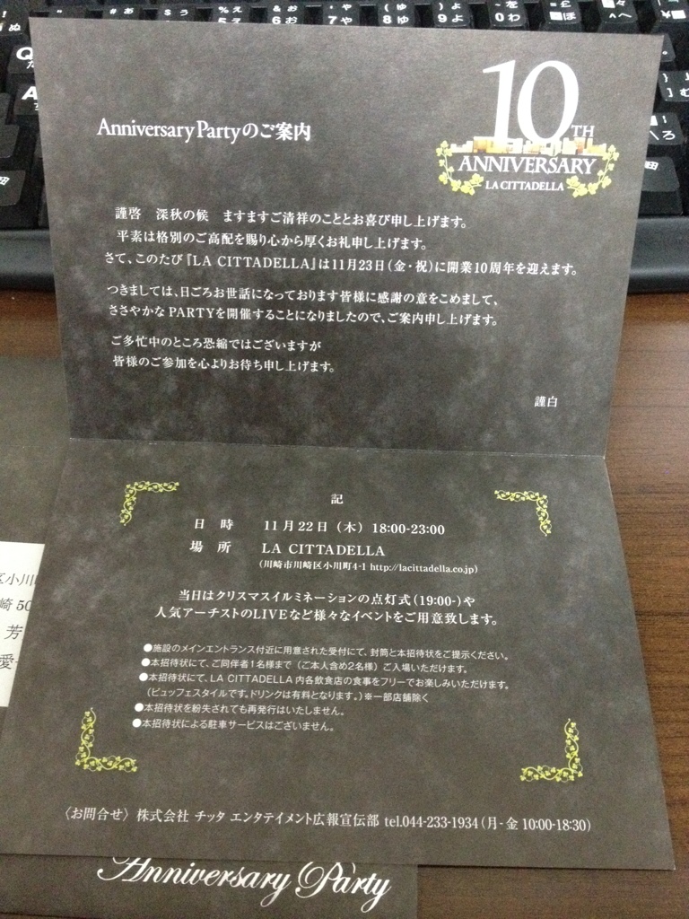 水曜日は定休日、木曜日は私の指定休にて久々の連休を頂きました。 火曜日の仕事を終える時はたっぷりと夜更かしを楽しむ勢いでしたが 結局疲れのため、起きていられず普通通りにベッドインしました。 更に翌日も疲れのためほとんど動けず、身体と神経を休める連休となり 2日間頭痛もとれず、私はどれだけ疲れているのかと情けなくなりました。 そんな連休でしたが、近所のチネチッタでは 『チネチッタオープン10周年記念祭』を行っており それだけは友人夫婦と参加してきました。 左写真はその招待状です。 チネチッタ自慢のネオンに酔いしれる観衆。 このネオンはクリスマスへの序曲を思わせます。 その後の年末カウントダウンも楽しみですね。 チネチッタの噴水にて美声を披露してくれました。 目と鼻の先で芸能人を見るのは初めてで、感激しました。 テレビで見るより数倍美しく、まるで芸術を見ているようです。 その途中にカウントダウンが始まり、チッタの棟に ネオンが点灯すると 盛り上がりも最高潮に達し、周りの温度も上がった感があ りました。 それから各店舗の食べ放題を回りましたが参加者が多くどこも長蛇の列。 3店舗まわったところで、もうお腹いっぱいになり体調優れないのもあり お開きとなりました。 普段はカジュアル的なラ・チッタデッラのスタッフですが、芸能人や企業の社長達を招待しての 記念イベントに緊張感を隠せない様子でした。 なぜかチッタの従業員はイケメンが多いですね。 クリスタルジェイドなどは男の私が見ても唸るほどの美男子揃いで、それ目当ての おばちゃん客も多数居そうですよ。 2012/11/23 (Fri) 19:19:11 |