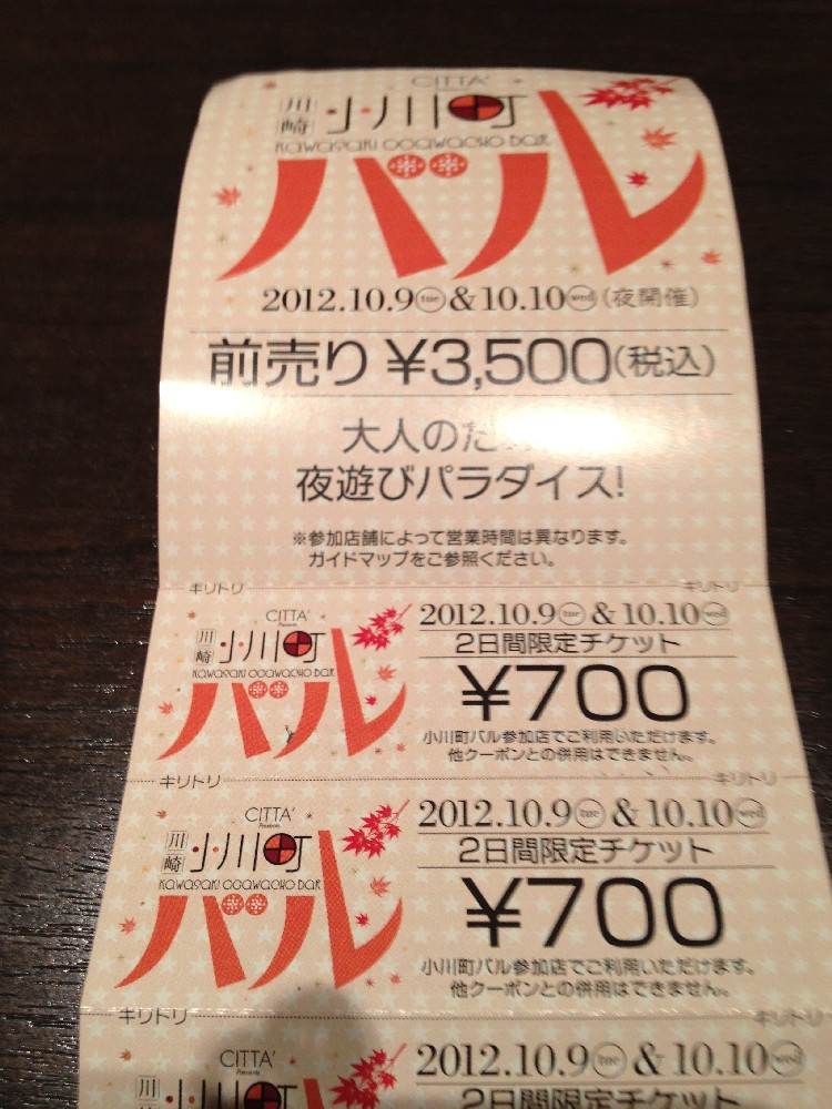 川崎では恒例となりました、『小川町バル』に行って来ました。 毎回毎回、高い満足度を提供してくれるこのイベントが 末永く続くことを願いながら、正直言ってこの内容でこの安さでは 店として赤字ではなかろうかと心配しています。 さて、知らない人の為に簡単に説明すると、チケットを購入し 小川町バル参加店の店で食べるだけですが、 この手のイベントでは当たり前ながら割安感があります。 更に、1枚700円なので、今まで敷居が高くて行きづらかった店にも行けて 味や雰囲気を試せます。 高級店で1品だけ食べて帰るなんて、普通は出来ませんが このイベントではそれが叶う訳です。 五枚綴りになっており 一枚700円×5=3500円になります。 各店舗でこれを1枚だし、用意された 小川町バル専用のメニューを頂く訳です。 興味深い店は山ほどありますが チケットはワンセット5枚なので5件に絞ります。 厳選したお店一覧をご覧下さい。 序盤は閉店時間が早い店を責めました。 1件目は『鮨辰』 (上左側写真) 鯛・平目・ハマチのにぎりと生ビール 2件目は『IL PINOLO』(イルピノーロ) (上右側写真) 鴨肉と3種のキノコのテリースと 生ビール or 焼酎(本日のお勧め) or サワー類 or 梅酒(本日のお勧め)or ソフトドリンクの中から1杯 3件目は『如水』(上写真) 博多名物 ごま鯖(ハーフサイズ) or 博多名物 酢もつのどちらか1品 生ビール or 焼酎(本日のお勧め) or サワー類 or 梅酒(本日のお勧め)or ソフトドリンクの中から1杯 4件目は『銀座酉十郎』(上写真) 唐揚げ or 唐揚げ黒酢仕立てのどちらか1品 生ビール or 角ハイボールのどちらか1杯 5件目がボリューム満点ですが 最後の店だったので、追加注文をしました。 小川町バル用のメニューは朝獲れ鮮魚盛り合せ日本酒3種の中から1杯 さて、お気づきかとは思いますが、5件目の店の名前は出しておりません。 個人的に隠れ家にしたいと思う店です。 一品一品、いちいちうっとりしてしまう味、他の人には教えたくなく、独占したいと 思ってしまう程の店が小川町の一角にあります。 どの店も絶品で、他にも行きたい店もありましたがお腹の限界もあり、 また次回とすることにしました。 PR 2012/10/11 (Thu) 19:02:44