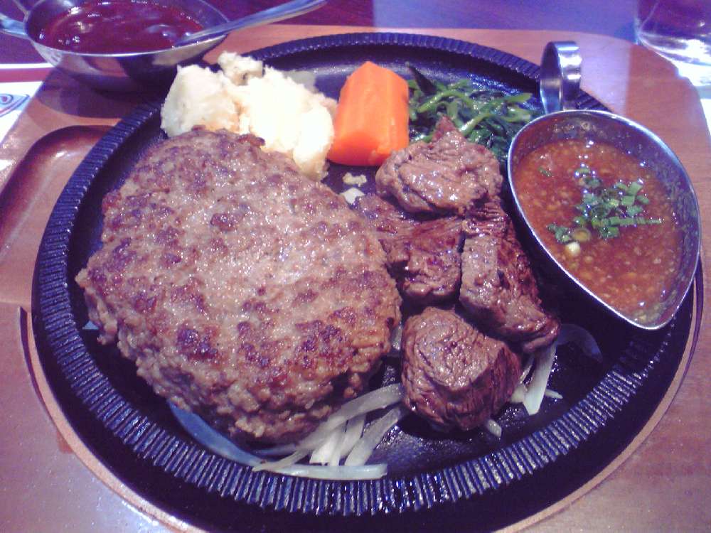 ちょっと前の 本丸亭閉店 の記事のコメントにあった SUEHIROですが、コメントには店舗が無くなっていた旨が 記されていましたが、つぶれたわけではなく、改築していたようで 新しく 『スエヒロ館』 としてオープンしました。 早速嫁、友人と一緒に行って参りました 全体的に若干高額になったようですが、充分な店構えと思います。 写真はハンバーグ&さいころステーキです。 さいころステーキがミディアムに焼かれ それはもう舌がとろけるようです。 これもミディアムに焼かれ 食べている最中は何となく 笑っている気がしました。 サラダバーも付き、ボリューム満点です。 皆様も一度行ってみてください 2010/11/09 (Tue) 18:09:34 |