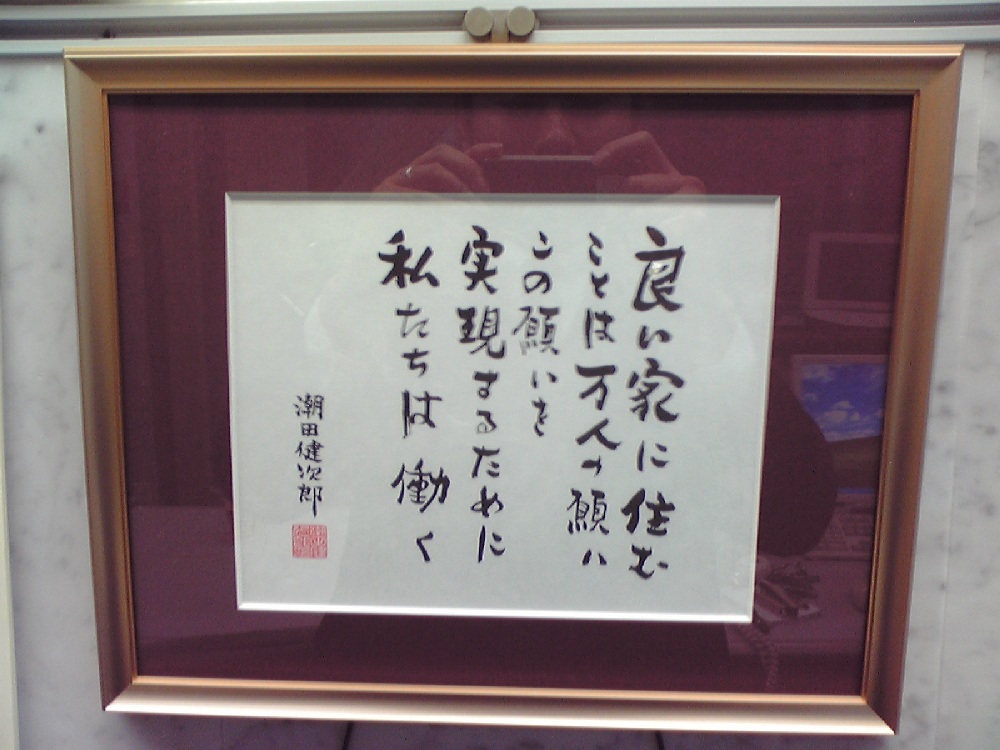 日々、仕事として建売を造り、販売している大庭商店は お客様の幸せをプロデュースするのが仕事と心得ております。 当社が施工を依頼している工務店でこのようなものを見つけました 嬉しい事です。 この信念を胸に、私たちは身を粉にして 働いております。 さて、今日は当社Webサイトの更新のお知らせを致します。 市場東中町の詳細ページに内装パノラマと外観写真を追加致しました。 パソコン上で内見が出来ます。 土地面積の割にLDKが大きいのはこの現場の売りで 更に角地。 2部屋は6帖以上で、この部屋の陽当たりは良好です。 駅から近いし、コンビニも近いし、車は入れやすいし 今回工務店の手違いで洗濯用水栓が混合水栓と上級なものが付いてます 皆様ご検討下さい。(*^_^*) 2011/07/19 (Tue) 18:58:11